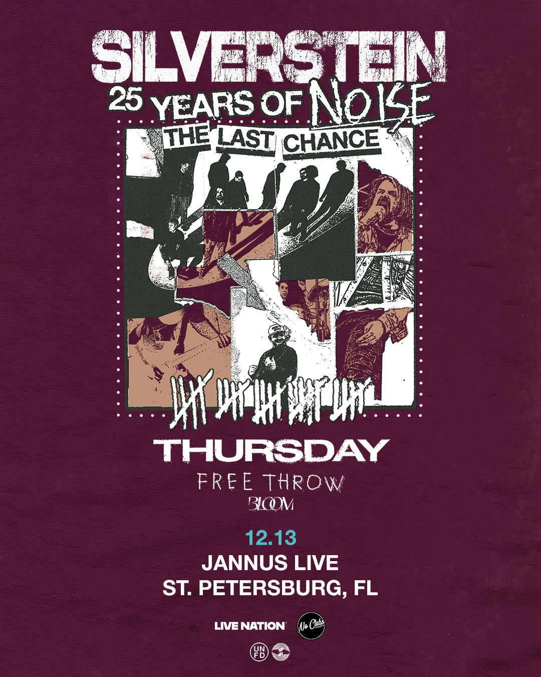 Jannus Live 200 1st Ave N STE 206,, St. Petersburg, FL, United StatesSilverstein: 25 Years of Noise Date: Saturday, December 13th, 2025 Support: Thursday, Free Throw, and Bloom Doors: 6:00 p.m. Show: 7:00 p.m. GET TICKETS